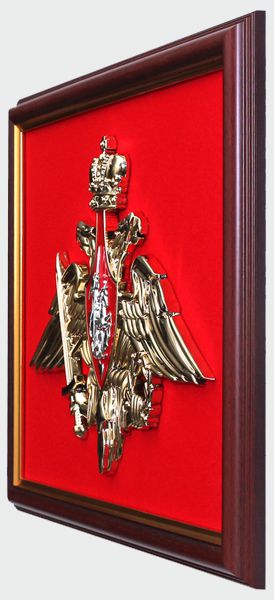 | Панно 65 x 42 см. (эмблема 56 x 33 см.) Щит - МДФ флок (иск. бархат) Эмблема: краска / металлизация Рамка: пластик ("красное дерево") |