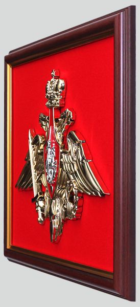 (эмблема 25 x 38,5 см.) Щит - МДФ флок (иск. бархат), Эмблема: краска / металлизация Рамка: пластик ("красное дерево") |