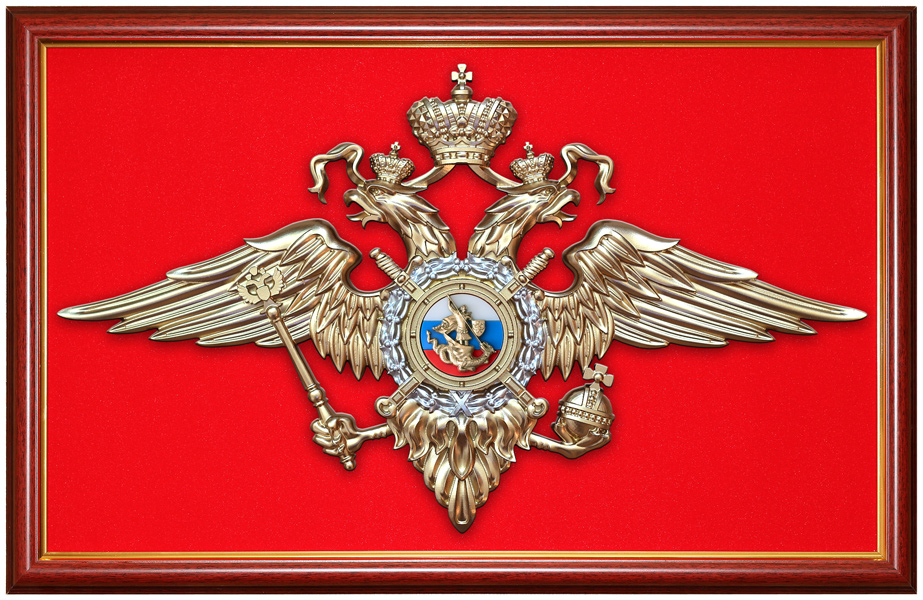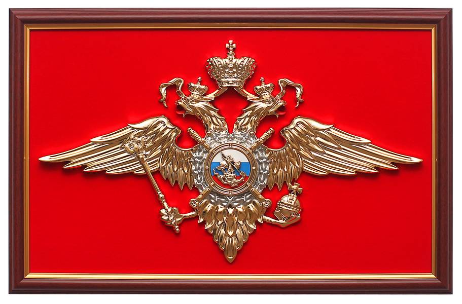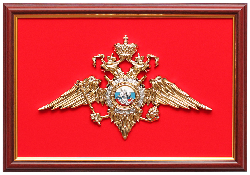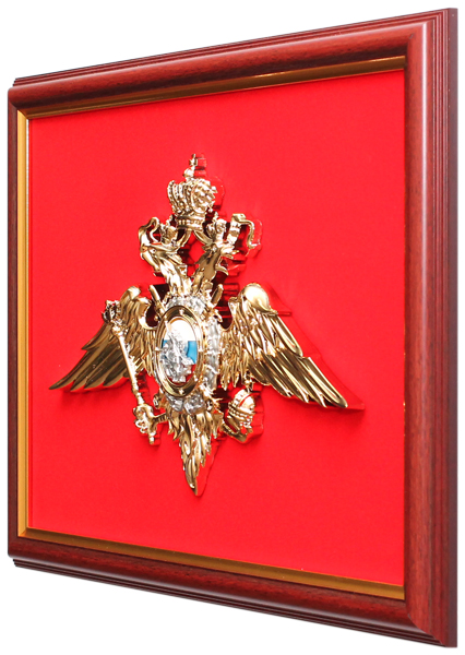 | Панно МВД | Панно 50 x 35 см. (эмблема 36 x 22 см.) Щит - МДФ флок (иск. бархат) Эмблема: краска / металлизация Рамка: пластик ("красное дерево") |